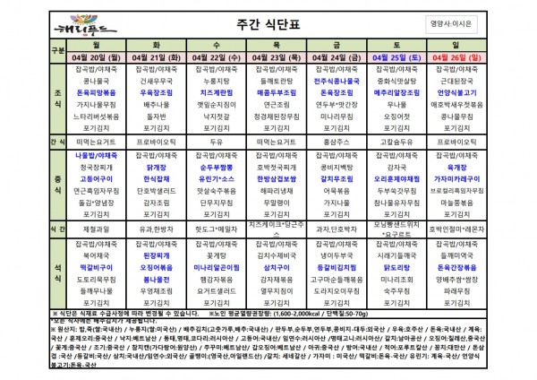 4월 셋째주 식단표 페이지 정보 작성자 은천노인복지회 작성일26-04-16 17:43 조회42회 댓글0건 관련링크 다음글 목록 답변 본문 4월 셋째주 어르신 식단표 안내해 드립니다. 정성과 영양을 담아 준비하겠습니다. 다음글 목록 답변
