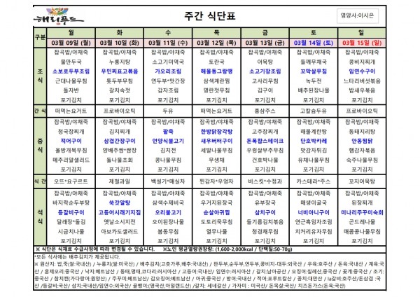 3월 둘째주 식단표 페이지 정보 작성자 은천노인복지회 작성일26-03-06 15:04 조회2,203회 댓글0건 관련링크 이전글 다음글 목록 답변 본문 3월 둘째주 어르신 식단표 안내해 드립니다. 정성과 영양을 담아 준비하겠습니다. 이전글 다음글 목록 답변