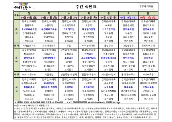 4월 첫째주 식단표 페이지 정보 작성자 은천노인복지회 작성일26-04-03 17:58 조회24회 댓글0건 관련링크 다음글 목록 답변 본문 4월 첫째주 어르신 식단표 안내해 드립니다. 정성과 영양을 담아 준비하겠습니다. 다음글 목록 답변