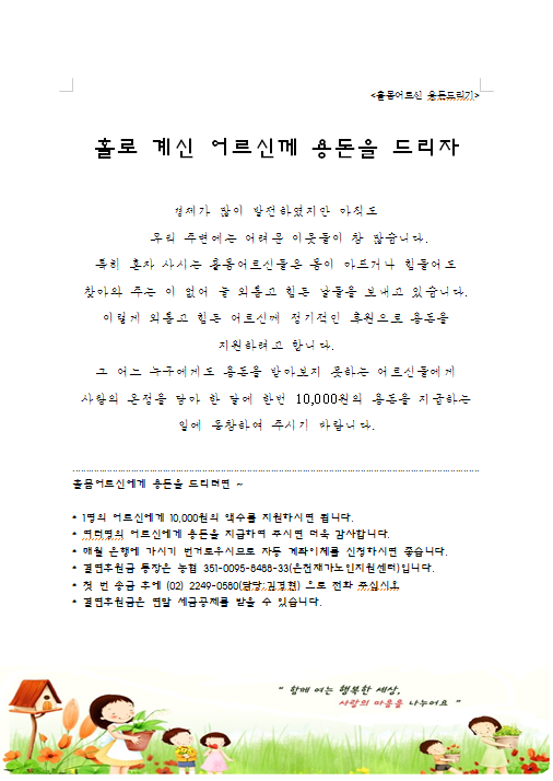 홀로계신 어르신께 용돈을 드리자 페이지 정보 작성자 은천노인복지회 작성일17-12-06 14:55 조회82,467회 댓글0건 관련링크 이전글 다음글 목록 답변 본문 홀몸 어르신께 용돈을 드리는 일에 함께 동참하여 주세요~~ 이전글 다음글 목록 답변