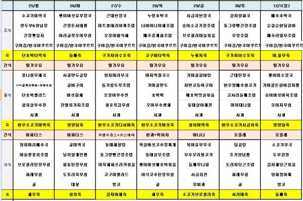 11월넷째주식단표 페이지 정보 작성자 은천노인복지회 작성일19-11-27 09:21 조회39,408회 댓글0건 관련링크 이전글 다음글 목록 답변 본문 ※ 모든 식사에는 잡곡밥과 김치가 제공됩니다. ※ 식단은 식재료수급에 의해 변경될 수 있습니다. 이전글 다음글 목록 답변