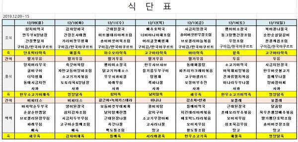 12월 둘재주 식단표 페이지 정보 작성자 은천노인복지회 작성일19-12-06 20:24 조회38,963회 댓글0건 관련링크 이전글 다음글 목록 답변 본문 ※ 모든 식사에는 잡곡밥과 김치가 제공됩니다. ※ 식단은 식재료수급에 의해 변경될 수 있습니다. 이전글 다음글 목록 답변