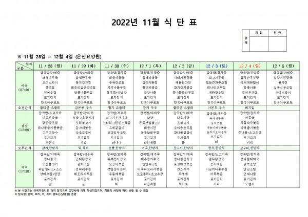 11월 넷째주 식단표 페이지 정보 작성자 은천노인복지회 작성일22-11-24 16:56 조회91,940회 댓글0건 관련링크 이전글 다음글 목록 답변 본문 . 이전글 다음글 목록 답변