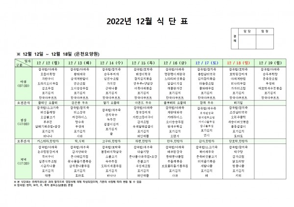 12월 둘째주 식단표 페이지 정보 작성자 은천노인복지회 작성일22-12-08 14:20 조회89,883회 댓글0건 관련링크 이전글 다음글 목록 답변 본문 . 이전글 다음글 목록 답변