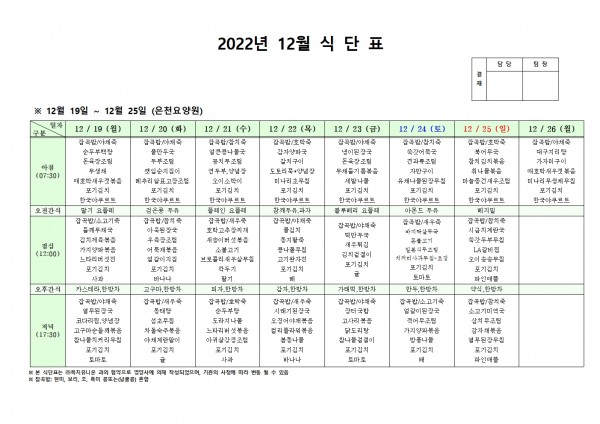 12월 셋째주 식단표 페이지 정보 작성자 은천노인복지회 작성일22-12-16 15:00 조회89,440회 댓글0건 관련링크 이전글 다음글 목록 답변 본문 . 이전글 다음글 목록 답변