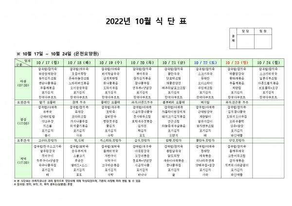 10월 셋째주 식단표 페이지 정보 작성자 은천노인복지회 작성일22-10-13 17:30 조회95,284회 댓글0건 관련링크 이전글 다음글 목록 답변 본문 . 이전글 다음글 목록 답변