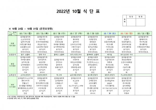 10월 넷째주 식단표 페이지 정보 작성자 은천노인복지회 작성일22-10-20 15:06 조회94,406회 댓글0건 관련링크 이전글 다음글 목록 답변 본문 . 이전글 다음글 목록 답변
