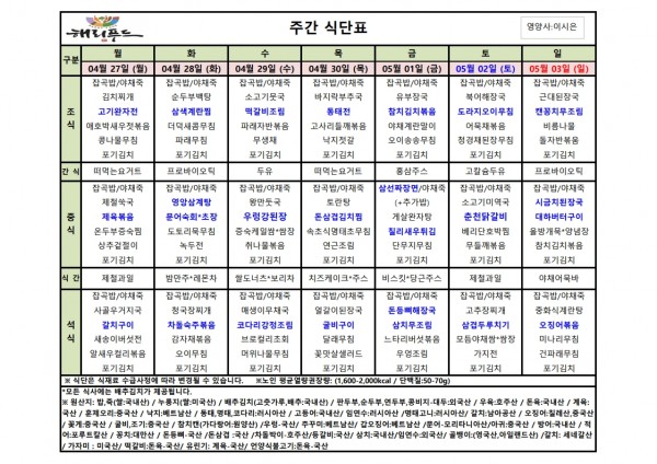 4월 넷째주 식단표 페이지 정보 작성자 은천노인복지회 작성일26-04-27 17:08 조회8회 댓글0건 관련링크 다음글 목록 답변 본문 4월 넷째주 어르신 식단표 안내해 드립니다. 정성과 영양을 담아 준비하겠습니다. 다음글 목록 답변
