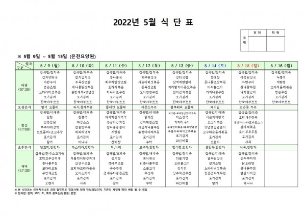5월 둘째주 식단표 페이지 정보 작성자 은천노인복지회 작성일22-05-06 10:04 조회107,583회 댓글0건 관련링크 이전글 다음글 목록 답변 본문 . 이전글 다음글 목록 답변