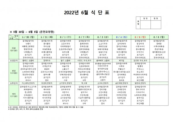 6월 첫째주 식단표 페이지 정보 작성자 은천노인복지회 작성일22-05-27 13:50 조회104,856회 댓글0건 관련링크 이전글 다음글 목록 답변 본문 . 이전글 다음글 목록 답변
