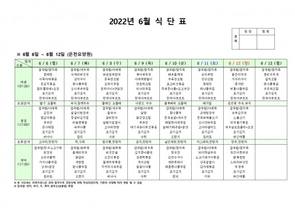 6월 둘째주 식단표 페이지 정보 작성자 은천노인복지회 작성일22-06-03 09:34 조회104,772회 댓글0건 관련링크 이전글 다음글 목록 답변 본문 . 이전글 다음글 목록 답변