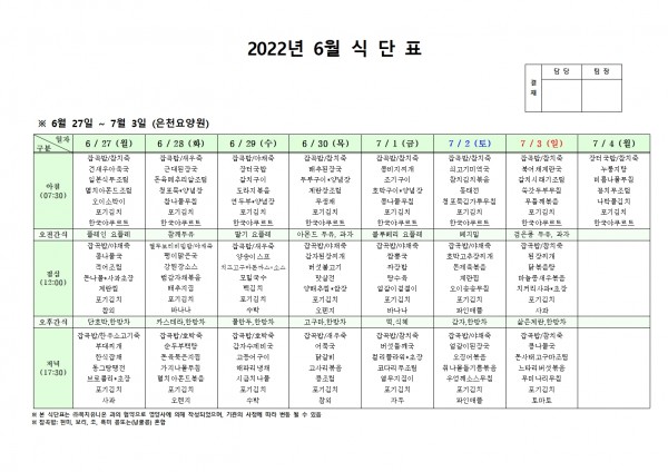 6월 넷째주 식단표 페이지 정보 작성자 은천노인복지회 작성일22-06-23 17:38 조회102,586회 댓글0건 관련링크 이전글 다음글 목록 답변 본문 . 이전글 다음글 목록 답변
