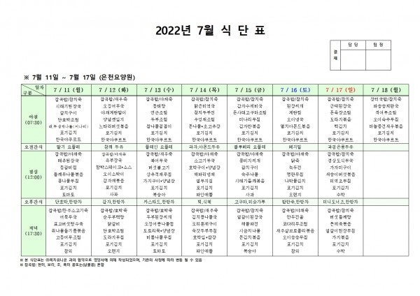 7월 둘째주 식단표 페이지 정보 작성자 은천노인복지회 작성일22-07-07 17:19 조회101,970회 댓글0건 관련링크 이전글 다음글 목록 답변 본문 . 이전글 다음글 목록 답변
