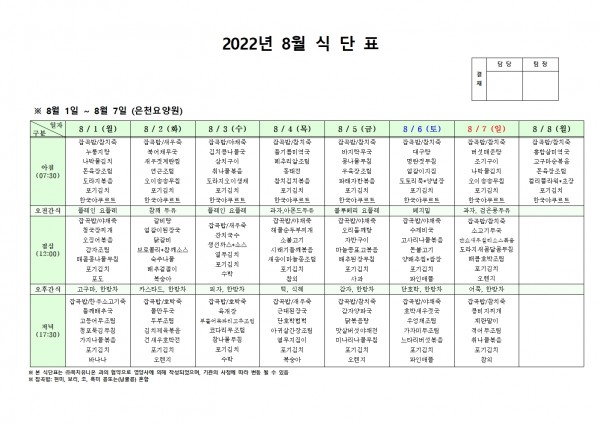 8월 첫째주 식단표 페이지 정보 작성자 은천노인복지회 작성일22-08-01 13:36 조회101,669회 댓글0건 관련링크 이전글 다음글 목록 답변 본문 . 이전글 다음글 목록 답변