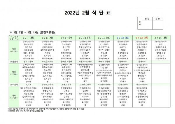 2월 둘째주 식단표 페이지 정보 작성자 은천노인복지회 작성일22-02-04 18:58 조회120,108회 댓글0건 관련링크 이전글 다음글 목록 답변 본문 . 이전글 다음글 목록 답변