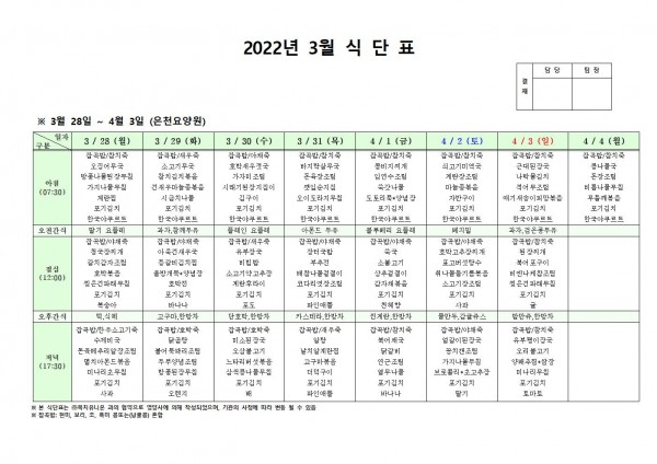 3월 다섯째주 식단표 페이지 정보 작성자 은천노인복지회 작성일22-03-25 10:40 조회113,529회 댓글0건 관련링크 이전글 다음글 목록 답변 본문 . 이전글 다음글 목록 답변