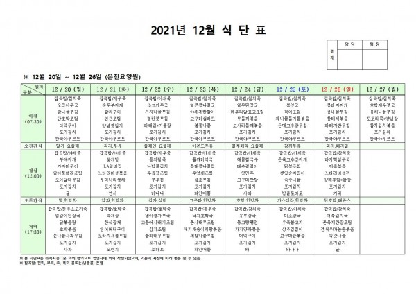 12월 넷째주 식단표 페이지 정보 작성자 은천노인복지회 작성일21-12-16 17:24 조회122,761회 댓글0건 관련링크 이전글 다음글 목록 답변 본문 . 이전글 다음글 목록 답변