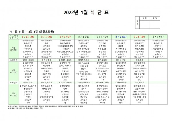 2월 첫째주 식단표 페이지 정보 작성자 은천노인복지회 작성일22-01-29 11:54 조회119,370회 댓글0건 관련링크 이전글 다음글 목록 답변 본문 . 이전글 다음글 목록 답변