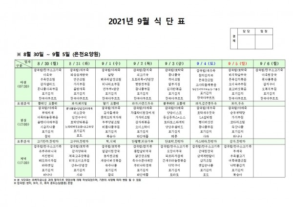 9월 첫째주 식단표 페이지 정보 작성자 은천노인복지회 작성일21-08-26 17:14 조회129,499회 댓글0건 관련링크 이전글 다음글 목록 답변 본문 . 이전글 다음글 목록 답변