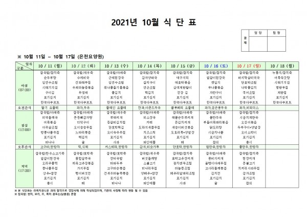 10월 둘째주 식단표 페이지 정보 작성자 은천노인복지회 작성일21-10-12 10:03 조회127,356회 댓글0건 관련링크 이전글 다음글 목록 답변 본문 . 이전글 다음글 목록 답변