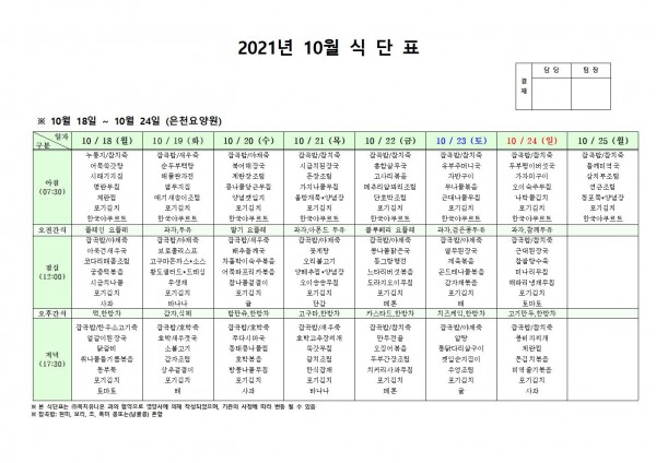10월 셋째주 식단표 페이지 정보 작성자 은천노인복지회 작성일21-10-14 16:24 조회126,645회 댓글0건 관련링크 이전글 다음글 목록 답변 본문 . 이전글 다음글 목록 답변