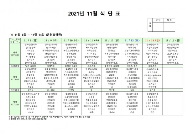 11월 둘째주 식단표 페이지 정보 작성자 은천노인복지회 작성일21-11-04 16:57 조회126,890회 댓글0건 관련링크 이전글 다음글 목록 답변 본문 . 이전글 다음글 목록 답변