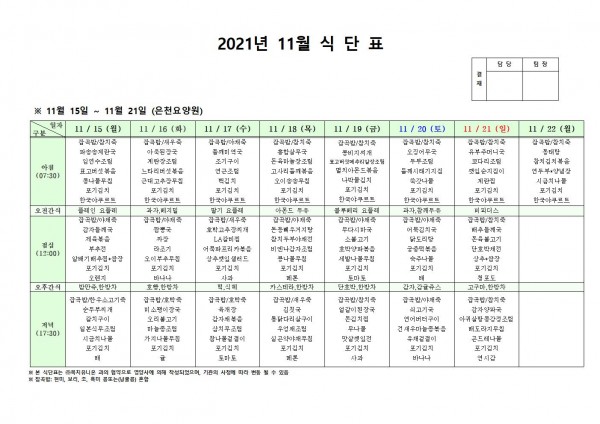 11월 셋째주 식단표 페이지 정보 작성자 은천노인복지회 작성일21-11-25 17:11 조회126,483회 댓글0건 관련링크 이전글 다음글 목록 답변 본문 . 이전글 다음글 목록 답변