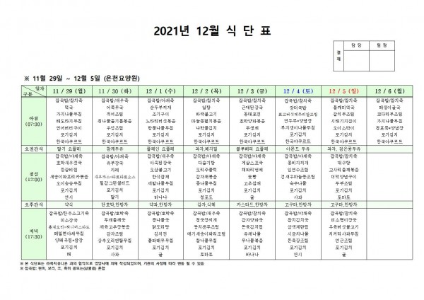 12월 첫째주 식단표 페이지 정보 작성자 은천노인복지회 작성일21-11-25 17:12 조회125,210회 댓글0건 관련링크 이전글 다음글 목록 답변 본문 . 이전글 다음글 목록 답변