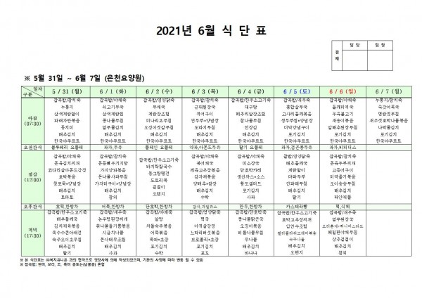 6월 첫째주 식단표 페이지 정보 작성자 은천노인복지회 작성일21-05-28 09:47 조회135,161회 댓글0건 관련링크 이전글 다음글 목록 답변 본문 . 이전글 다음글 목록 답변
