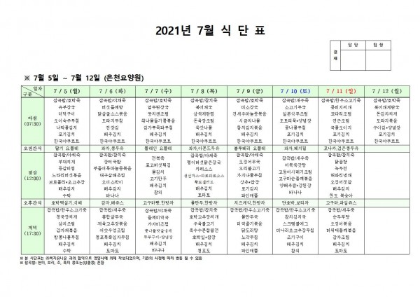 7월 첫째주 식단표 페이지 정보 작성자 은천노인복지회 작성일21-07-02 16:57 조회134,523회 댓글0건 관련링크 이전글 다음글 목록 답변 본문 . 이전글 다음글 목록 답변