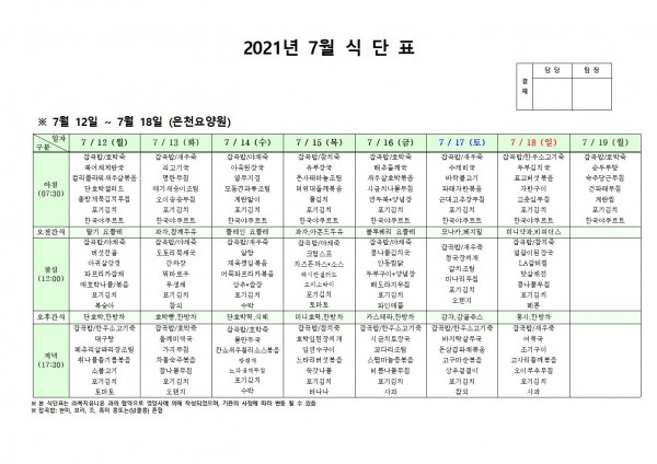 7월 둘째주 식단표 페이지 정보 작성자 은천노인복지회 작성일21-07-22 11:18 조회133,420회 댓글0건 관련링크 이전글 다음글 목록 답변 본문 . 이전글 다음글 목록 답변