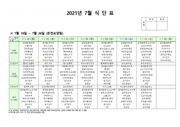 7월 셋째주 식단표 페이지 정보 작성자 은천노인복지회 작성일21-07-22 11:18 조회133,225회 댓글0건 관련링크 이전글 다음글 목록 답변 본문 . 이전글 다음글 목록 답변