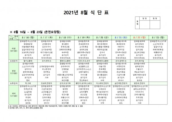 8월 셋째주 식단표 페이지 정보 작성자 은천노인복지회 작성일21-08-12 17:43 조회131,315회 댓글0건 관련링크 이전글 다음글 목록 답변 본문 . 이전글 다음글 목록 답변