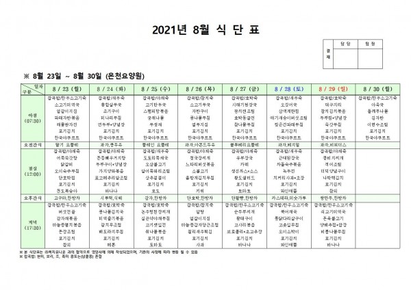 8월 넷째주 식단표 페이지 정보 작성자 은천노인복지회 작성일21-08-19 17:44 조회131,609회 댓글0건 관련링크 이전글 다음글 목록 답변 본문 . 이전글 다음글 목록 답변