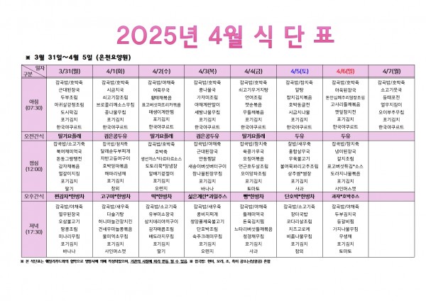 2025년 4월 첫주 식단표 페이지 정보 작성자 은천노인복지회 작성일25-03-28 10:25 조회14,181회 댓글0건 관련링크 이전글 다음글 목록 답변 본문 . 이전글 다음글 목록 답변