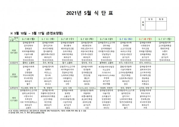 5월 둘째주 식단표 페이지 정보 작성자 은천노인복지회 작성일21-05-06 22:23 조회137,962회 댓글0건 관련링크 이전글 다음글 목록 답변 본문 5월 둘째주 식단표 이전글 다음글 목록 답변