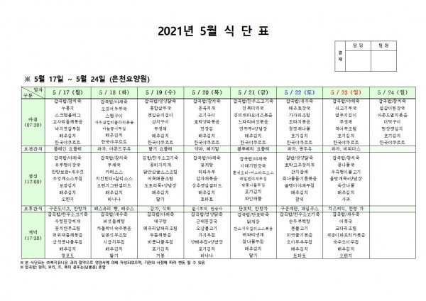 5월 셋째주 식단표 페이지 정보 작성자 은천노인복지회 작성일21-05-13 19:27 조회136,973회 댓글0건 관련링크 이전글 다음글 목록 답변 본문 5월 셋째주 식단표 이전글 다음글 목록 답변