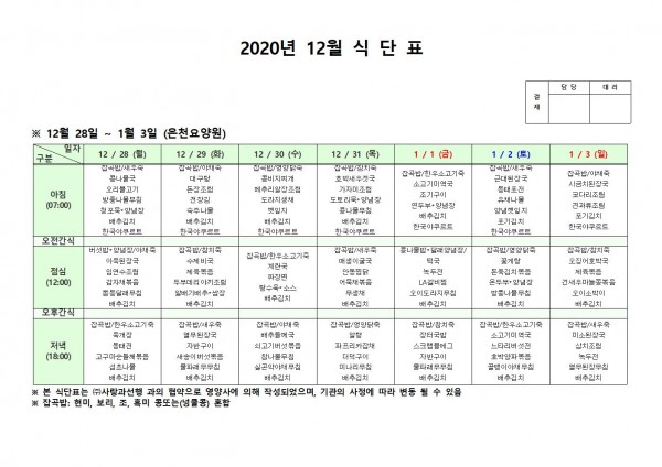 12월 다섯째주 식단표 페이지 정보 작성자 은천노인복지회 작성일20-12-24 18:17 조회150,146회 댓글0건 관련링크 이전글 다음글 목록 답변 본문 . 이전글 다음글 목록 답변