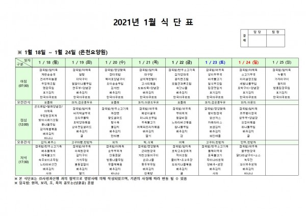 1월 셋째주 식단표 페이지 정보 작성자 은천노인복지회 작성일21-01-15 10:02 조회148,662회 댓글0건 관련링크 이전글 다음글 목록 답변 본문 . 이전글 다음글 목록 답변