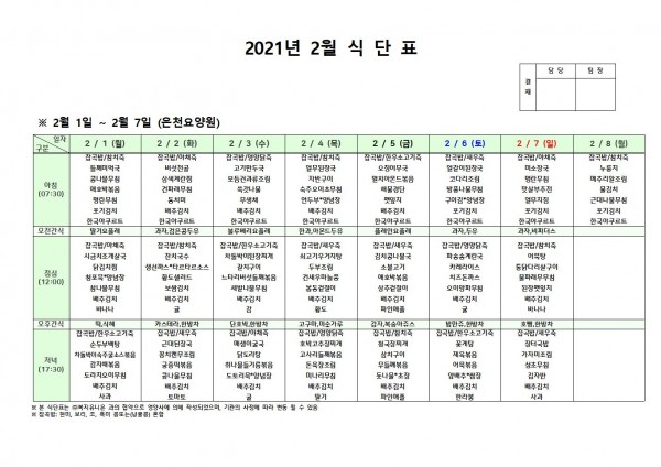 2월 첫째주 식단표 페이지 정보 작성자 은천노인복지회 작성일21-01-28 17:45 조회148,667회 댓글0건 관련링크 이전글 다음글 목록 답변 본문 . 이전글 다음글 목록 답변