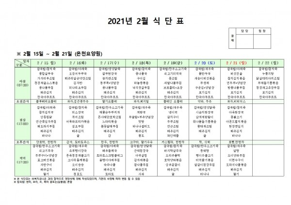 2월 셋째주 식단표 페이지 정보 작성자 은천노인복지회 작성일21-02-15 14:12 조회147,298회 댓글0건 관련링크 이전글 다음글 목록 답변 본문 2월 식단표 [이 게시물은 은천노인복지회님에 의해 2021-03-12 17:18:24 공지사항에서 이동 됨] 이전글 다음글 목록 답변