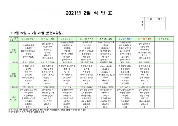 2월 넷째주 식단표 페이지 정보 작성자 은천노인복지회 작성일21-02-19 12:05 조회145,753회 댓글0건 관련링크 이전글 다음글 목록 답변 본문 2월 4주 식단표 [이 게시물은 은천노인복지회님에 의해 2021-03-12 17:18:24 공지사항에서 이동 됨] 이전글 다음글 목록 답변