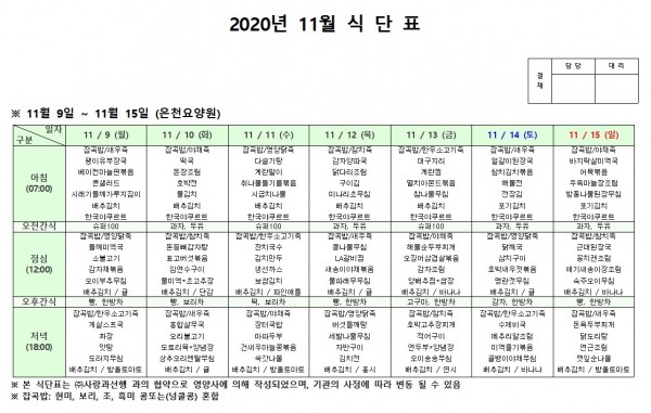 11월 둘째주 식단표 페이지 정보 작성자 은천노인복지회 작성일20-12-08 18:09 조회155,508회 댓글0건 관련링크 이전글 다음글 목록 답변 본문 11월 둘째주 식단표 이전글 다음글 목록 답변