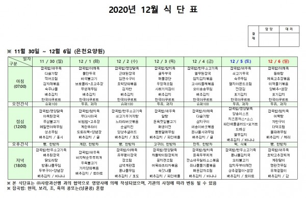 12월 첫째주 식단표 페이지 정보 작성자 은천노인복지회 작성일20-12-08 18:10 조회154,280회 댓글0건 관련링크 이전글 다음글 목록 답변 본문 . 이전글 다음글 목록 답변