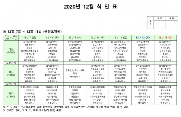 12월 둘째주 식단표 페이지 정보 작성자 은천노인복지회 작성일20-12-08 18:11 조회154,140회 댓글0건 관련링크 이전글 다음글 목록 답변 본문 . 이전글 다음글 목록 답변