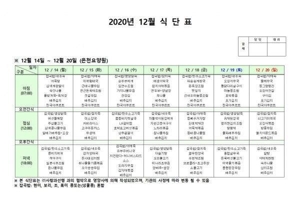 12월 셋째주 식단표 페이지 정보 작성자 은천노인복지회 작성일20-12-15 13:41 조회153,832회 댓글0건 관련링크 이전글 다음글 목록 답변 본문 . 이전글 다음글 목록 답변