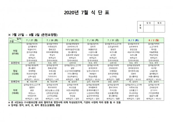7월 다섯째주 식단표 페이지 정보 작성자 은천노인복지회 작성일20-08-10 11:32 조회165,720회 댓글0건 관련링크 이전글 다음글 목록 답변 본문 . 이전글 다음글 목록 답변
