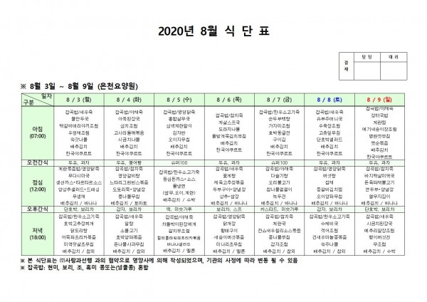 8월 첫째주 식단표 페이지 정보 작성자 은천노인복지회 작성일20-08-10 11:33 조회164,886회 댓글0건 관련링크 이전글 다음글 목록 답변 본문 , 이전글 다음글 목록 답변
