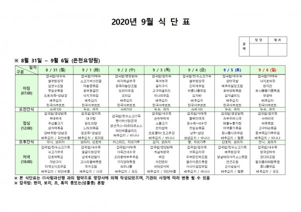 9월 첫째주 식단표 페이지 정보 작성자 은천노인복지회 작성일20-09-07 14:40 조회163,143회 댓글0건 관련링크 이전글 다음글 목록 답변 본문 * 이전글 다음글 목록 답변