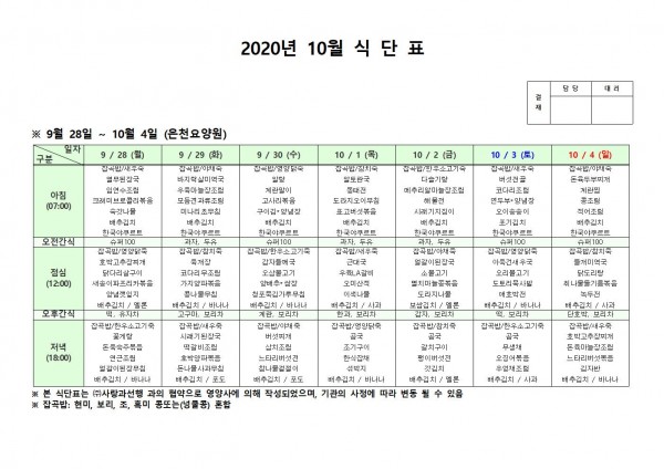 10월 첫째주 식단표 페이지 정보 작성자 은천노인복지회 작성일20-10-12 14:45 조회160,481회 댓글0건 관련링크 이전글 다음글 목록 답변 본문 . 이전글 다음글 목록 답변